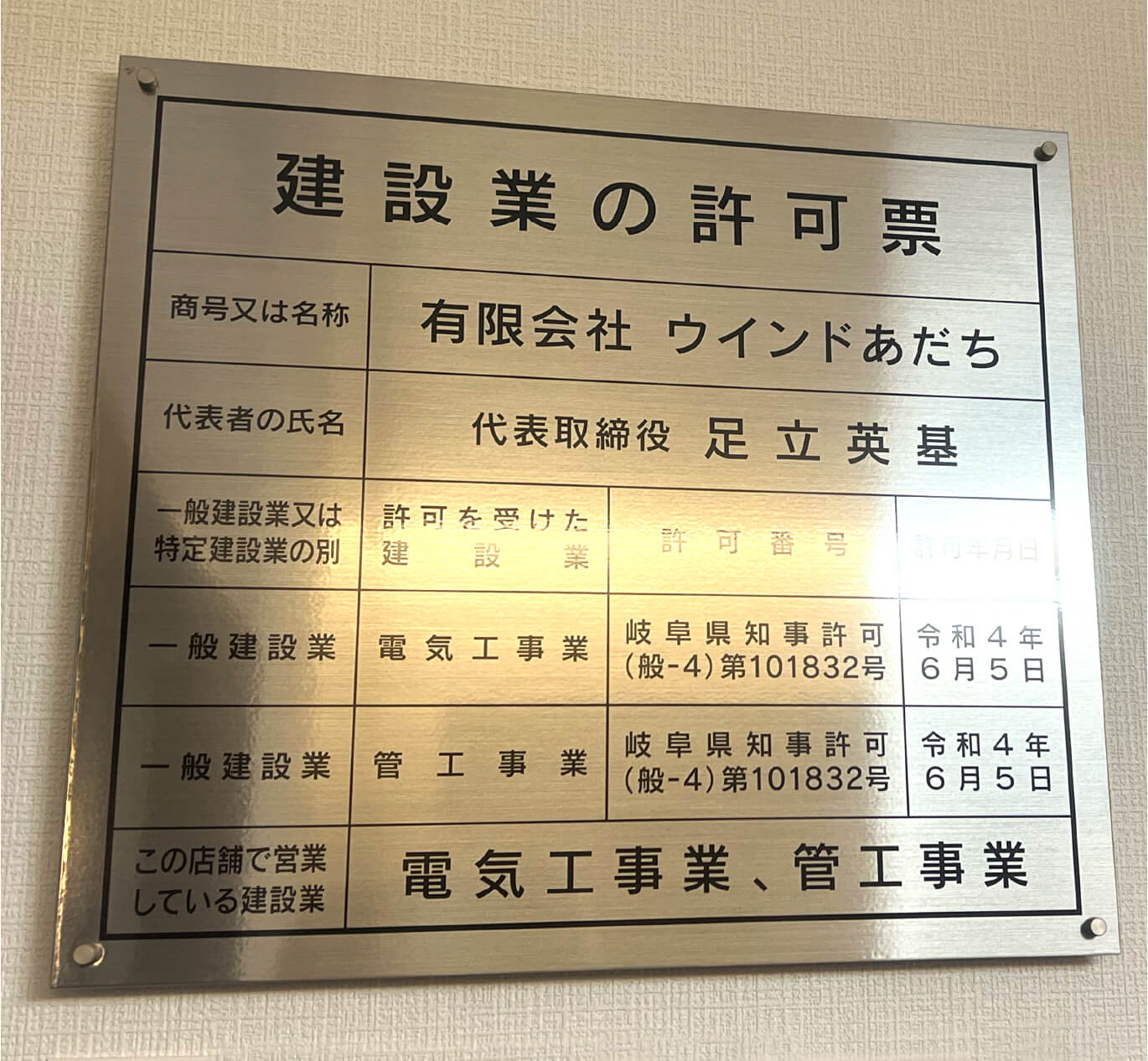 | 許可 | 岐阜県知事許可 電気/管工事業 第101832号 |